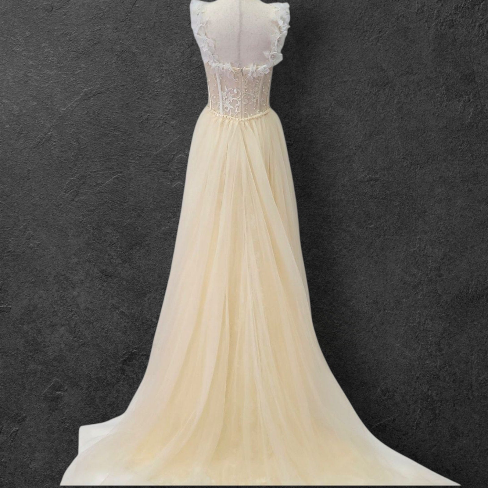 Elevate your bridal presence with this exquisite champagne floral patterned ballgown. The structured bodice creates a flattering silhouette while delicate white flower straps add a touch of romance. Intricate floral patterns cascade down the voluminous skirt and elegant train, creating a sophisticated statement as you glide down the aisle. This timeless design balances traditional grace with contemporary elegance.