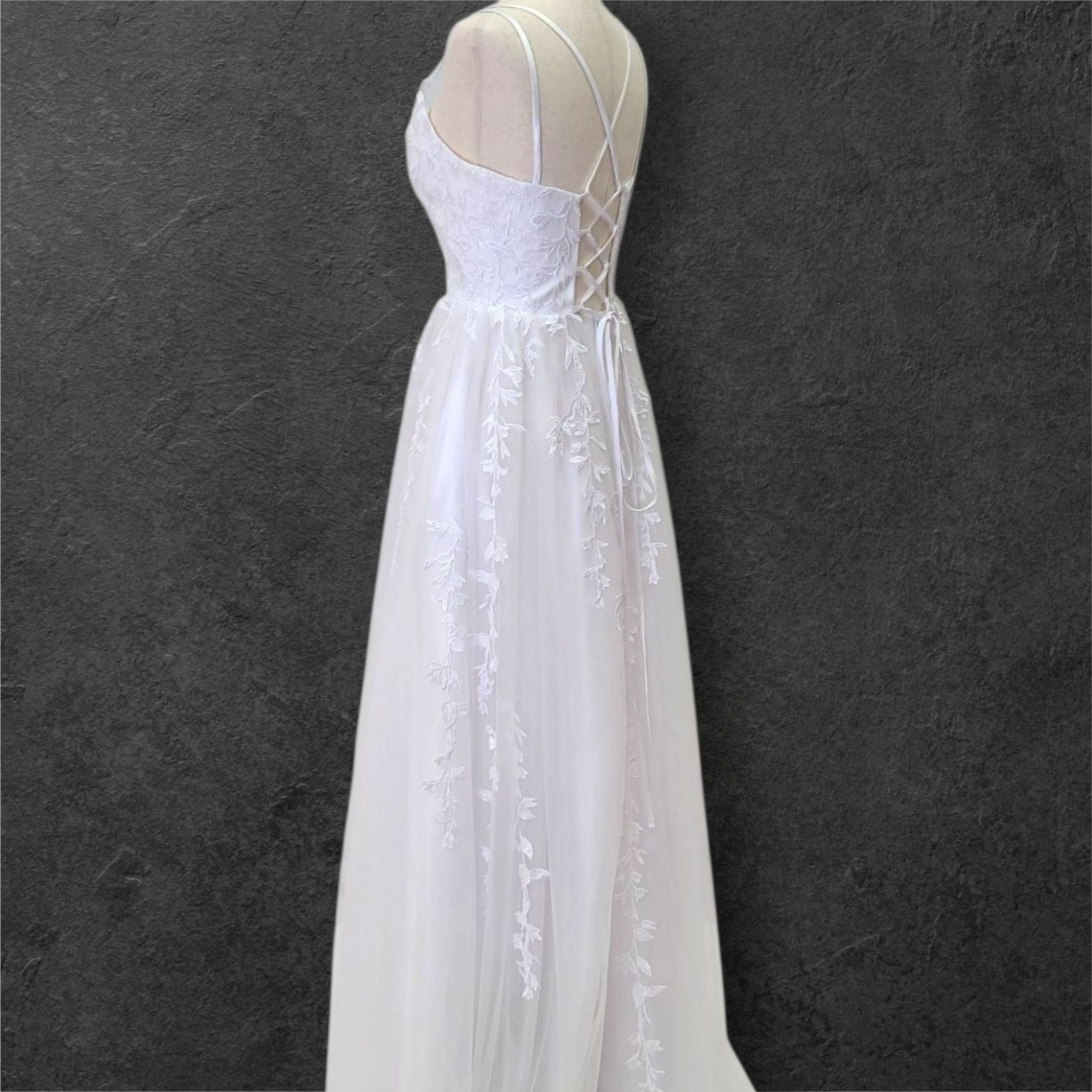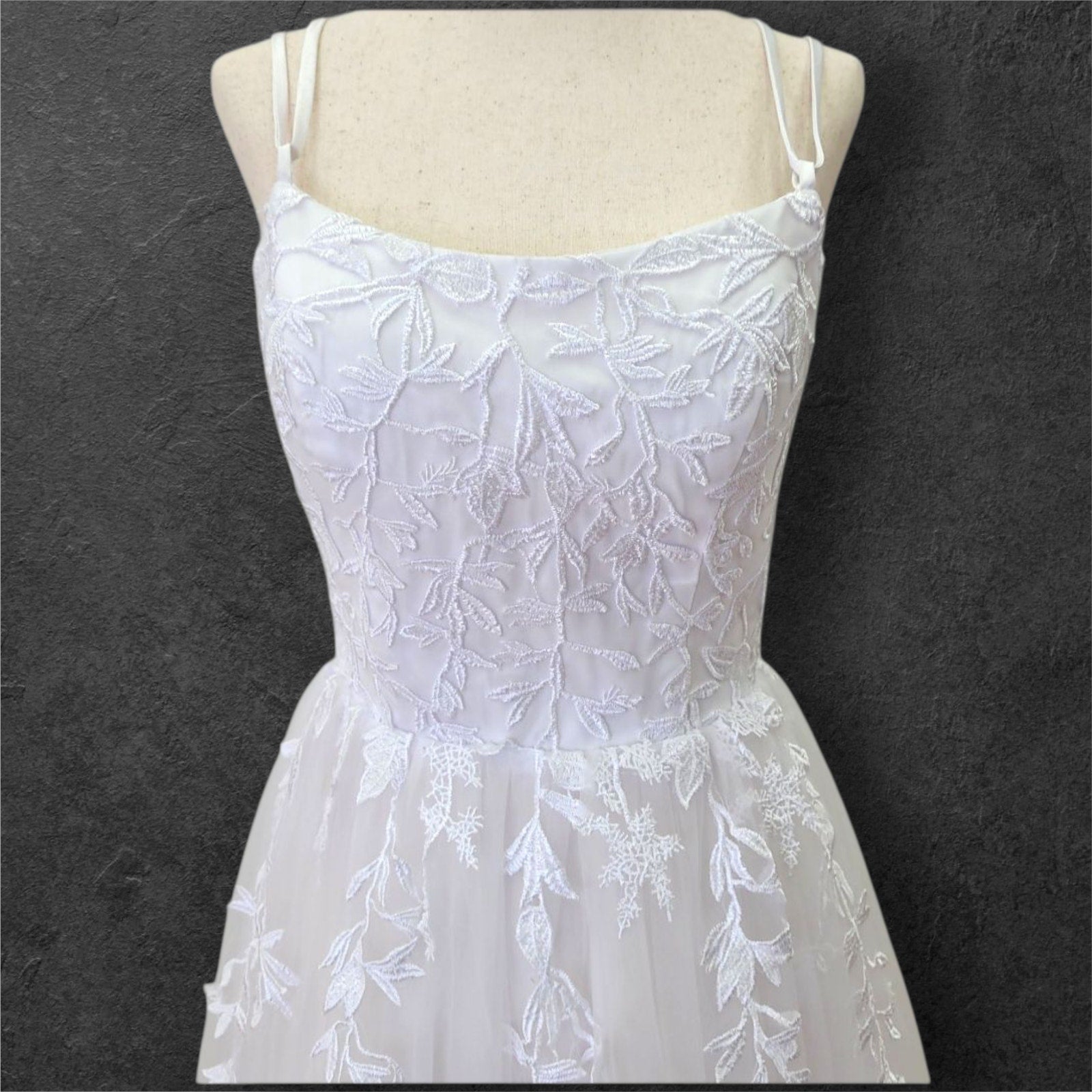 Exquisitely crafted, this pristine white wedding gown features an elegant scoop neckline and delicate strappy details. The sophisticated corset back ensures a perfect silhouette, while intricate vine appliques adorn the bodice and cascade gracefully down the tulle skirt and train. Discreetly integrated pockets add practical luxury to this timeless bridal masterpiece.