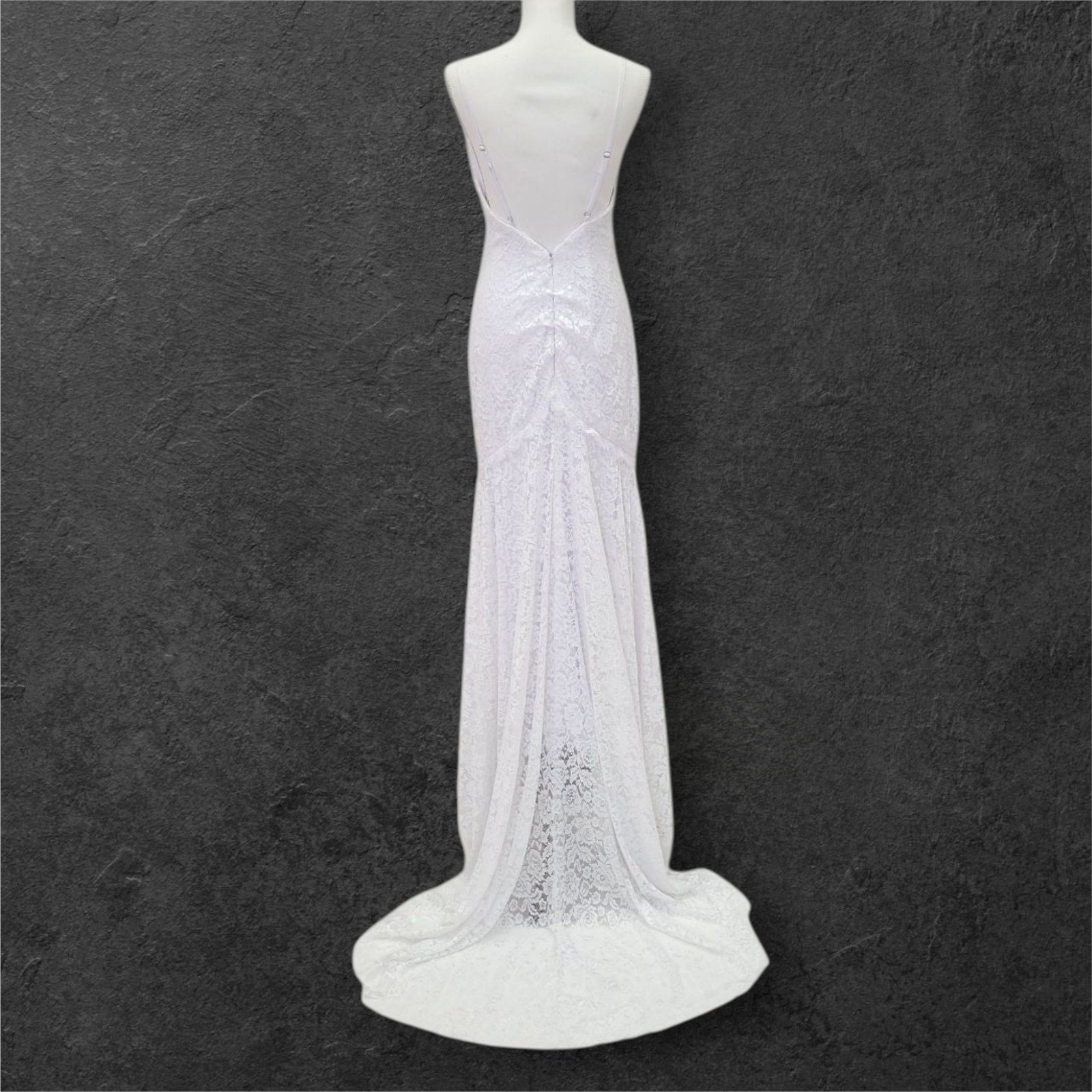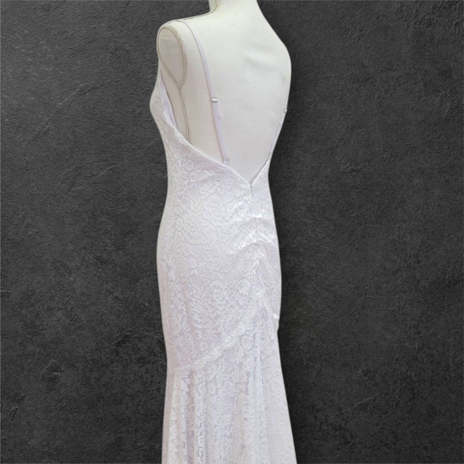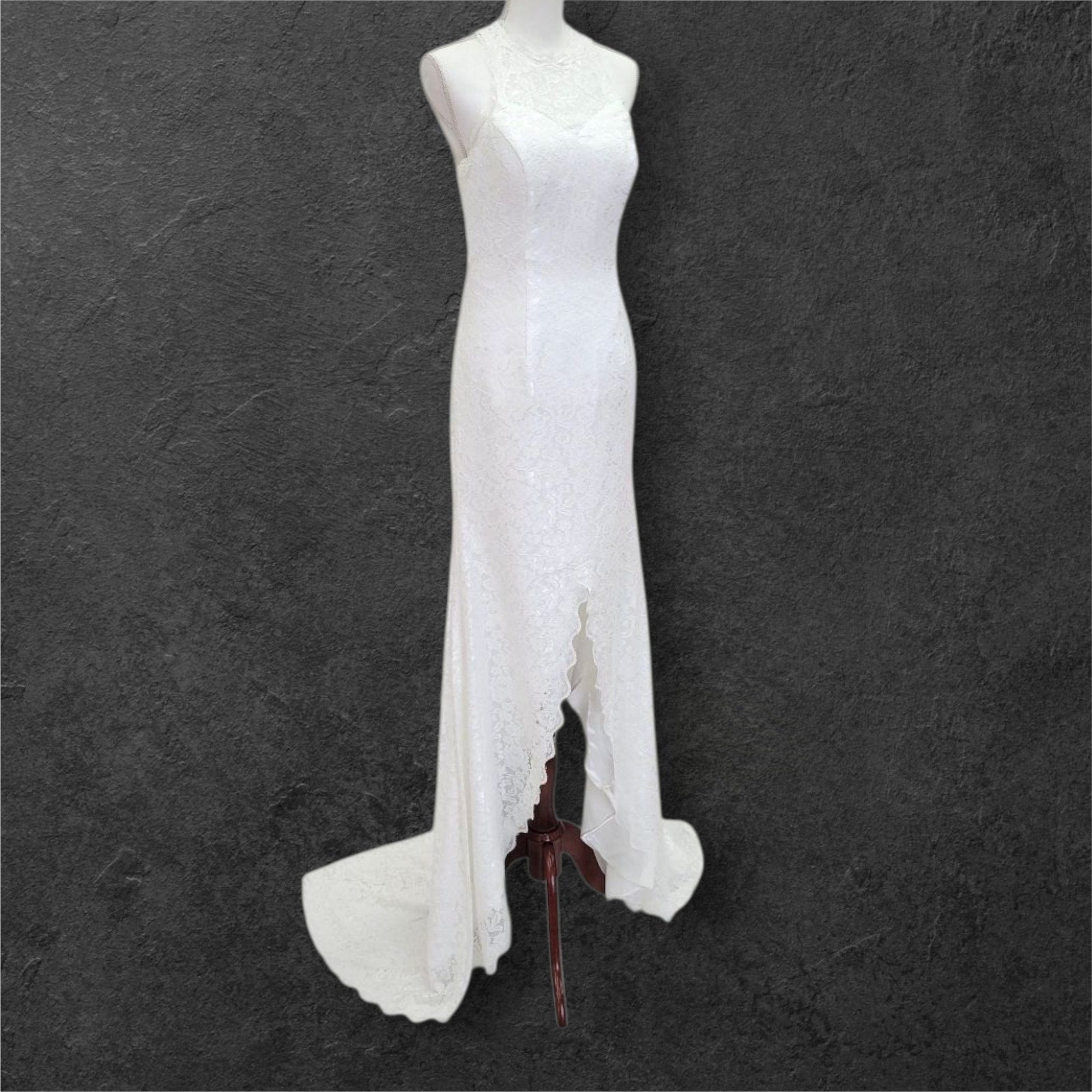 Exquisitely crafted with delicate lace detailing, this elegant wedding gown features an alluring low back design that embodies refined grace. The lightweight silhouette flows effortlessly, making it the quintessential choice for discerning brides planning summer beach or destination ceremonies. A harmonious blend of timeless romance and contemporary sophistication.