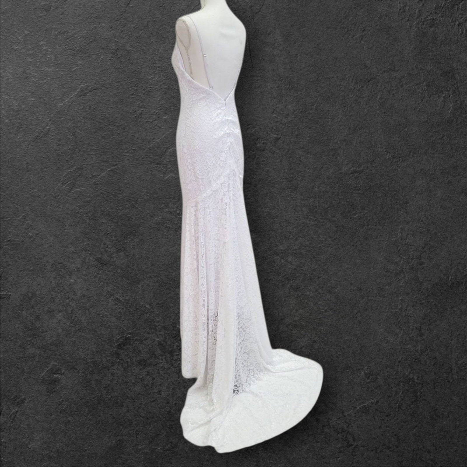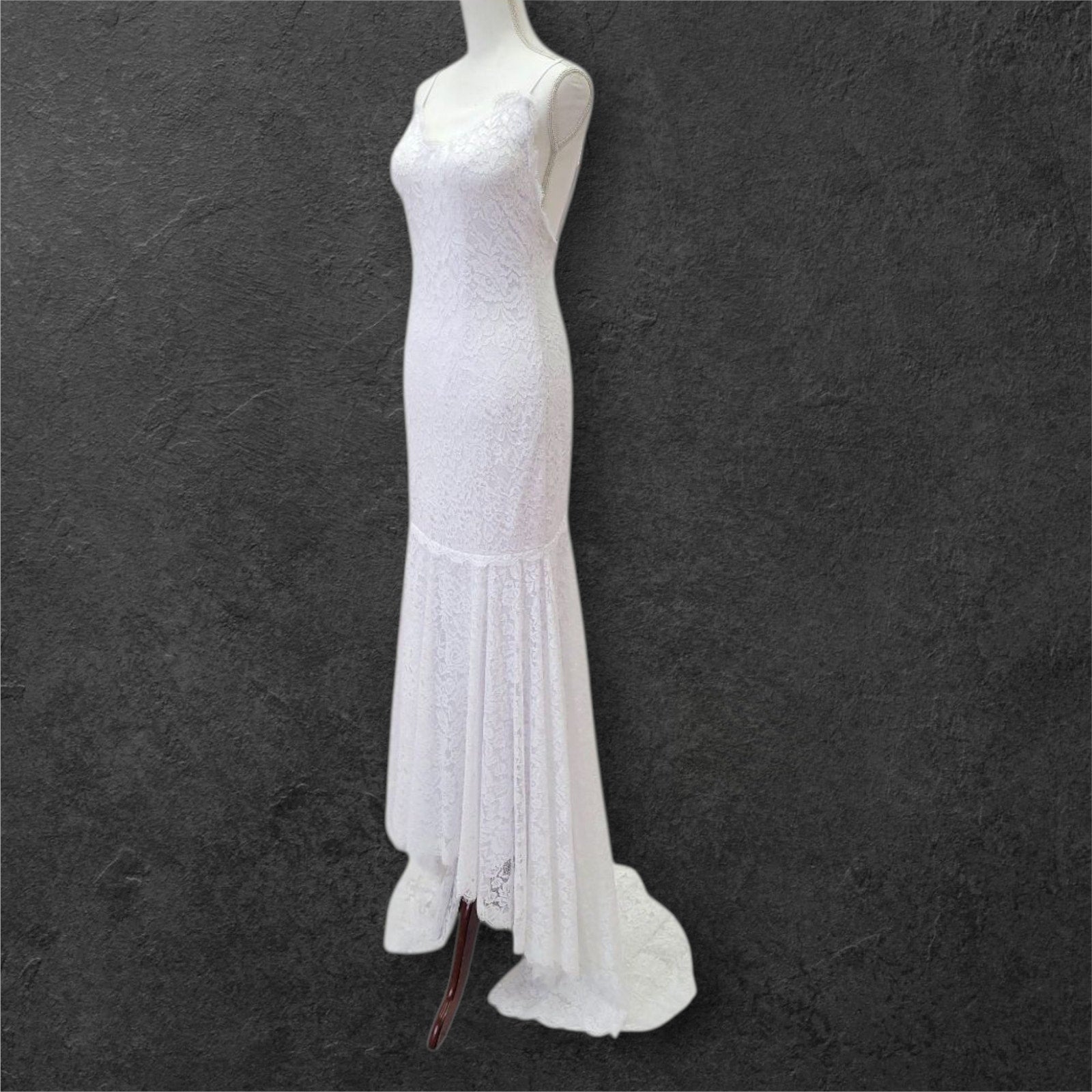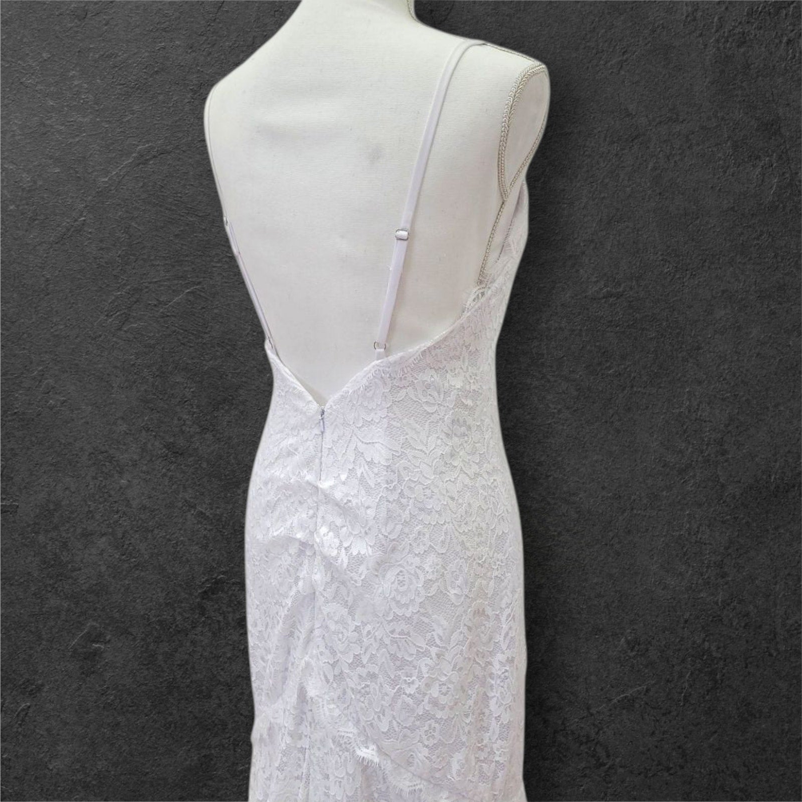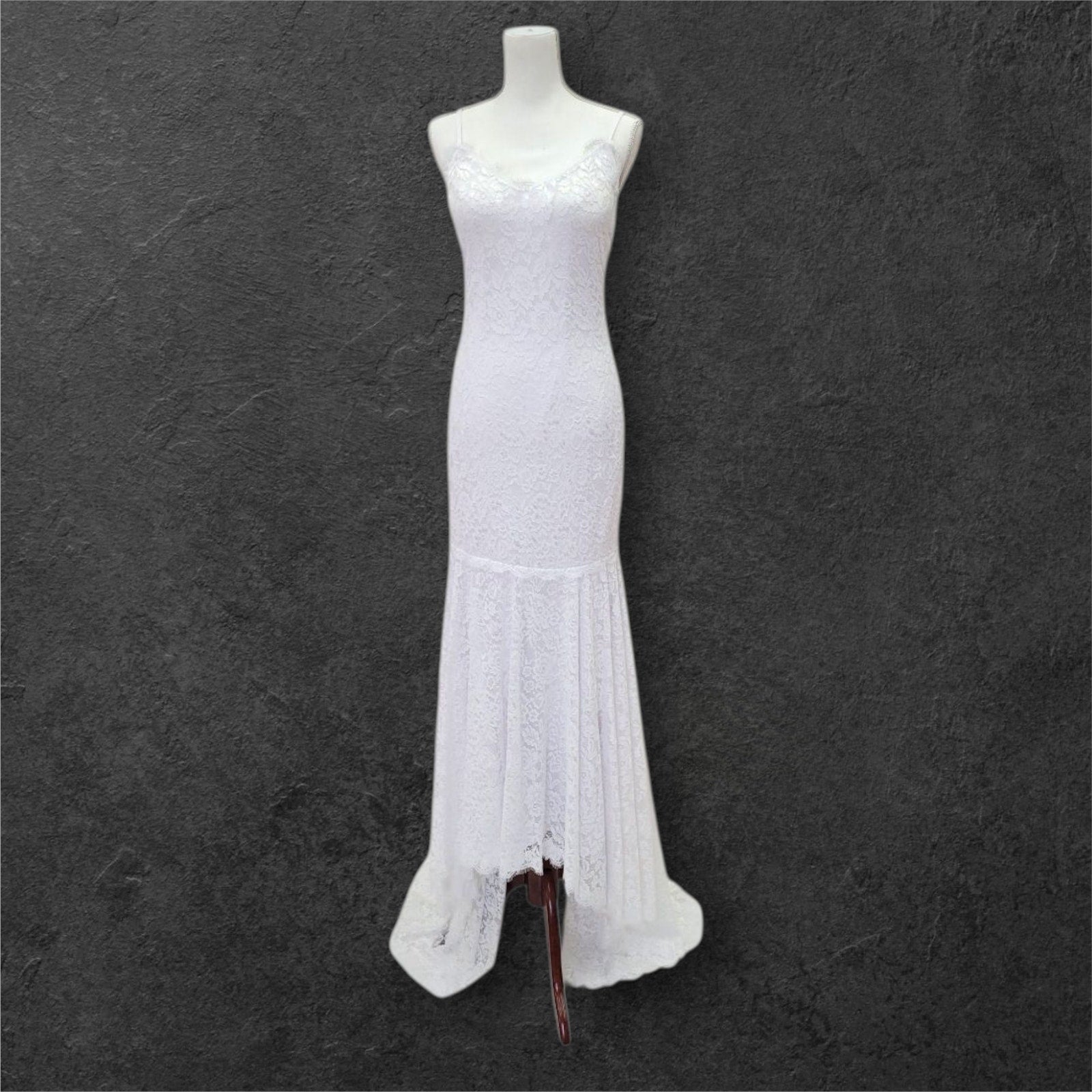 Exquisitely crafted with delicate lace detailing, this elegant wedding gown features an alluring low back design that embodies refined grace. The lightweight silhouette flows effortlessly, making it the quintessential choice for discerning brides planning summer beach or destination ceremonies. A harmonious blend of timeless romance and contemporary sophistication.