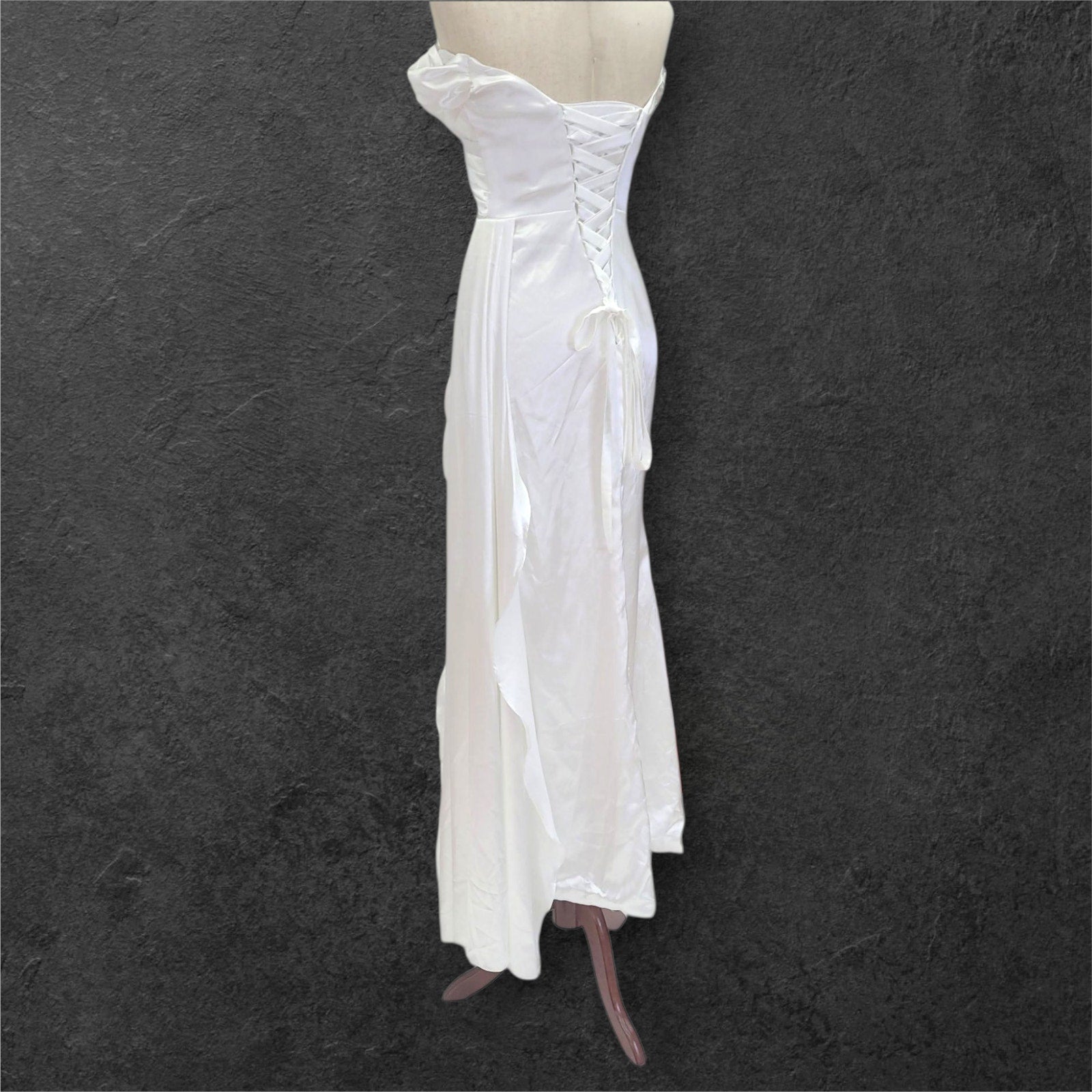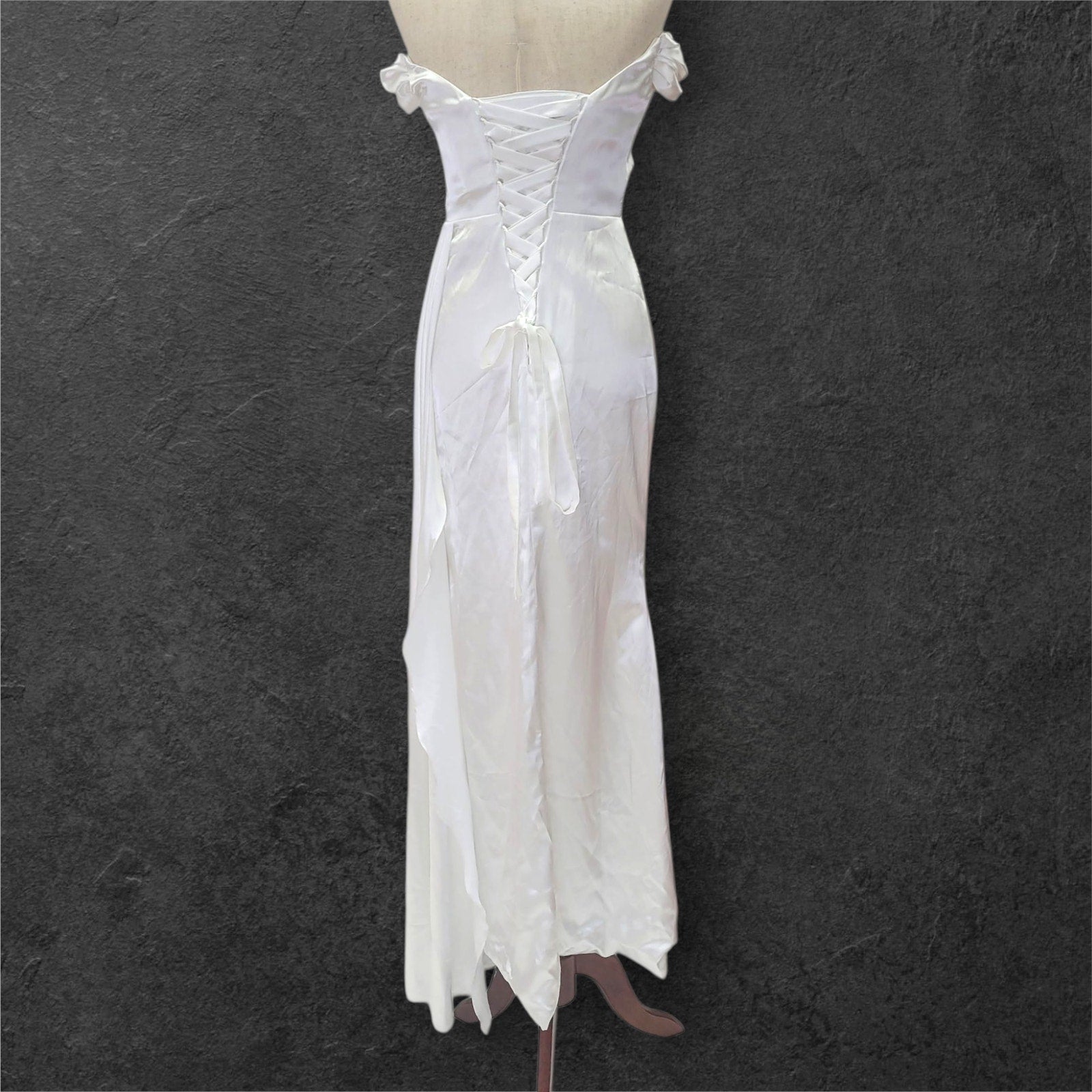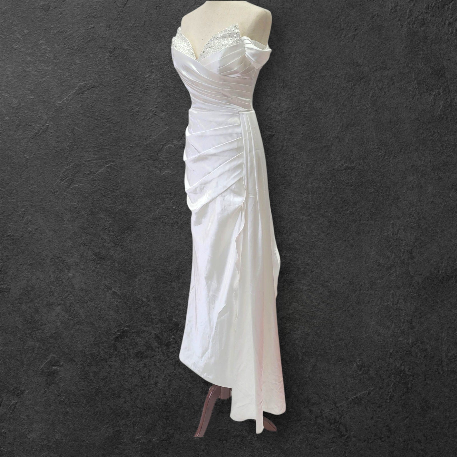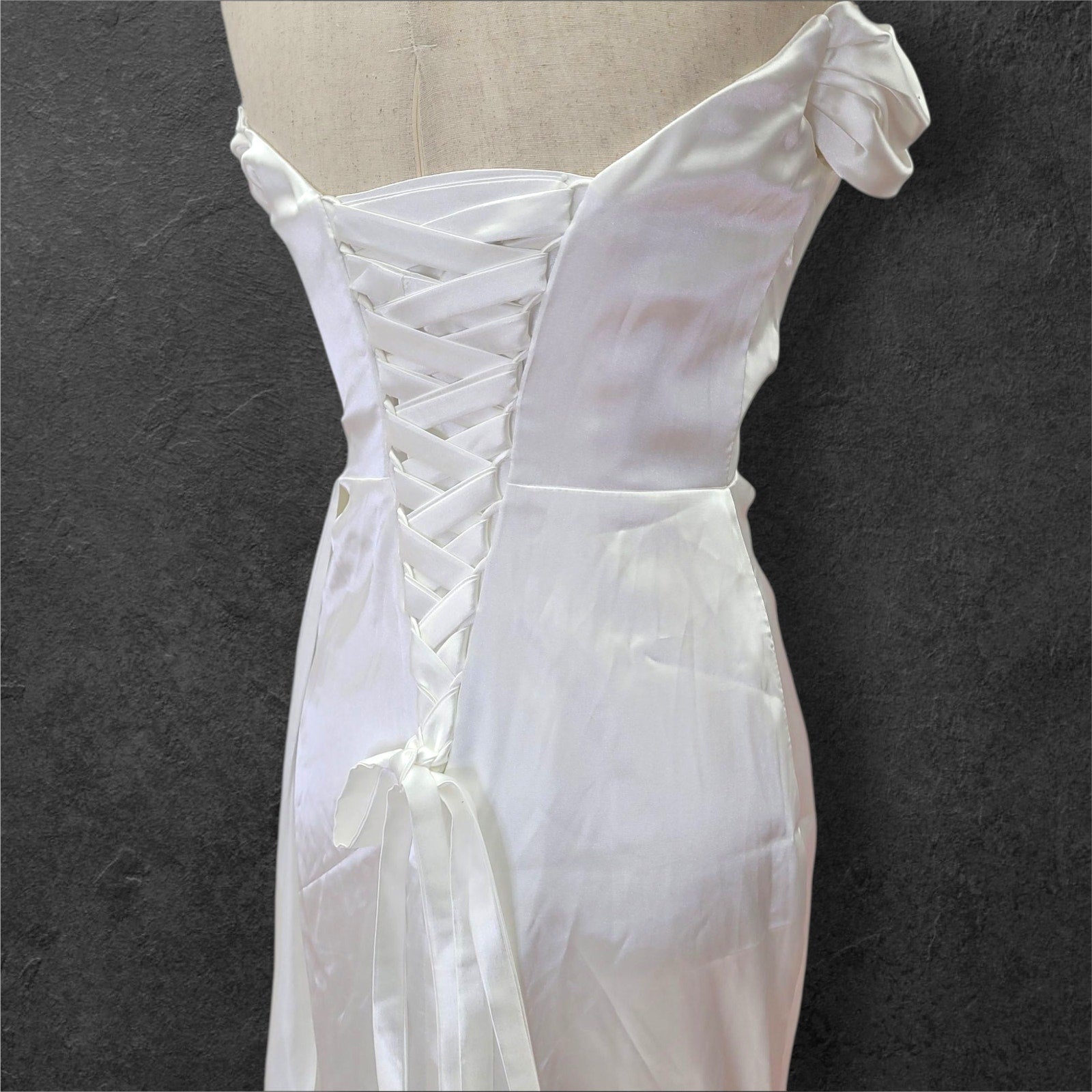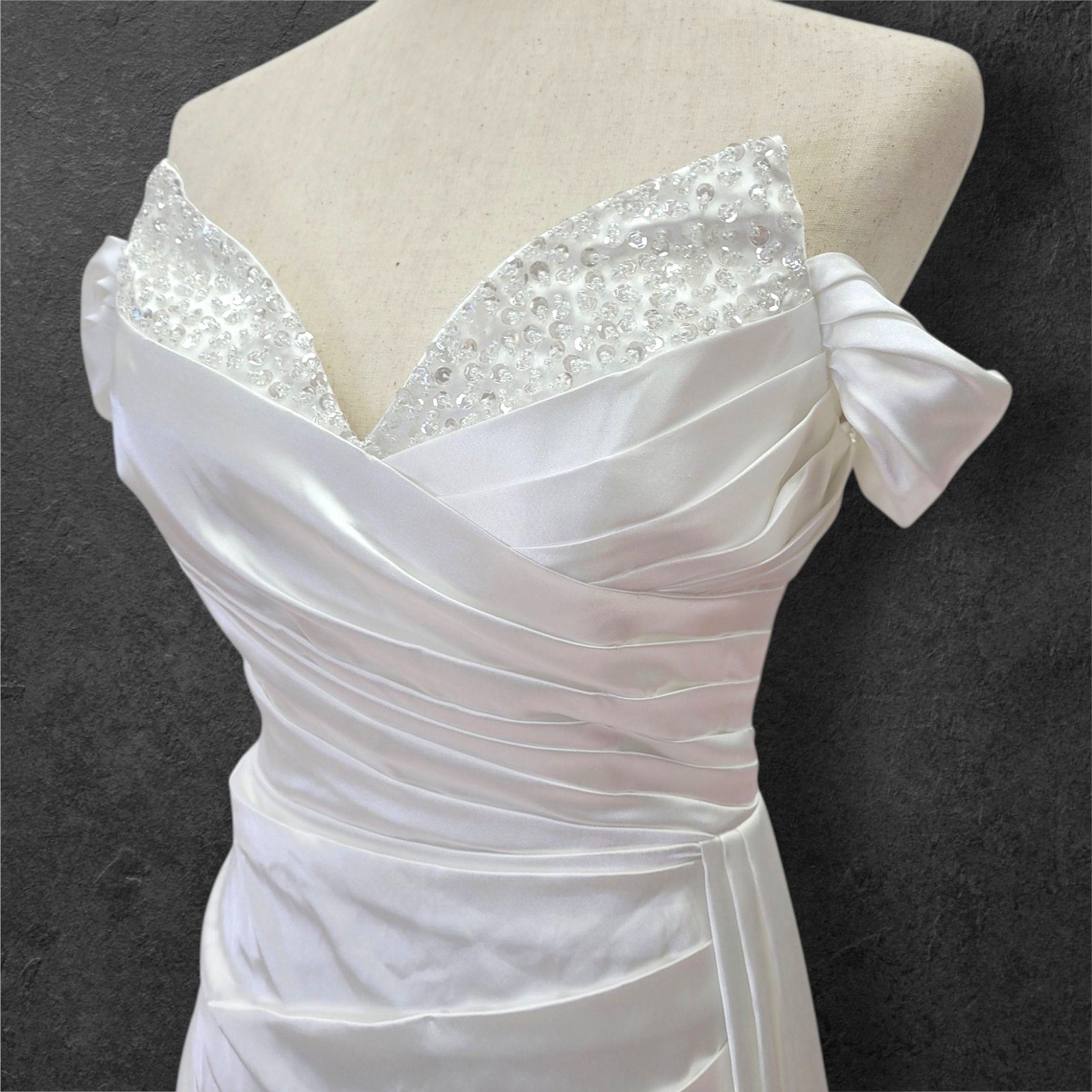 Exuding timeless elegance, this sophisticated wedding gown features graceful off-shoulder sleeves and luxurious satin construction. The dramatic 18-inch corset back ensures a perfect, customizable fit while enhancing your silhouette. A refined side train adds movement and architectural interest, creating a memorable entrance and exit for your most cherished occasion.