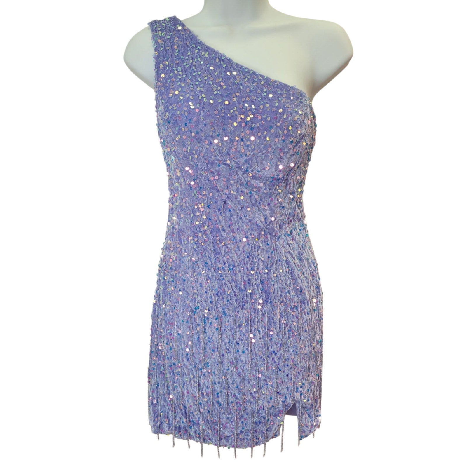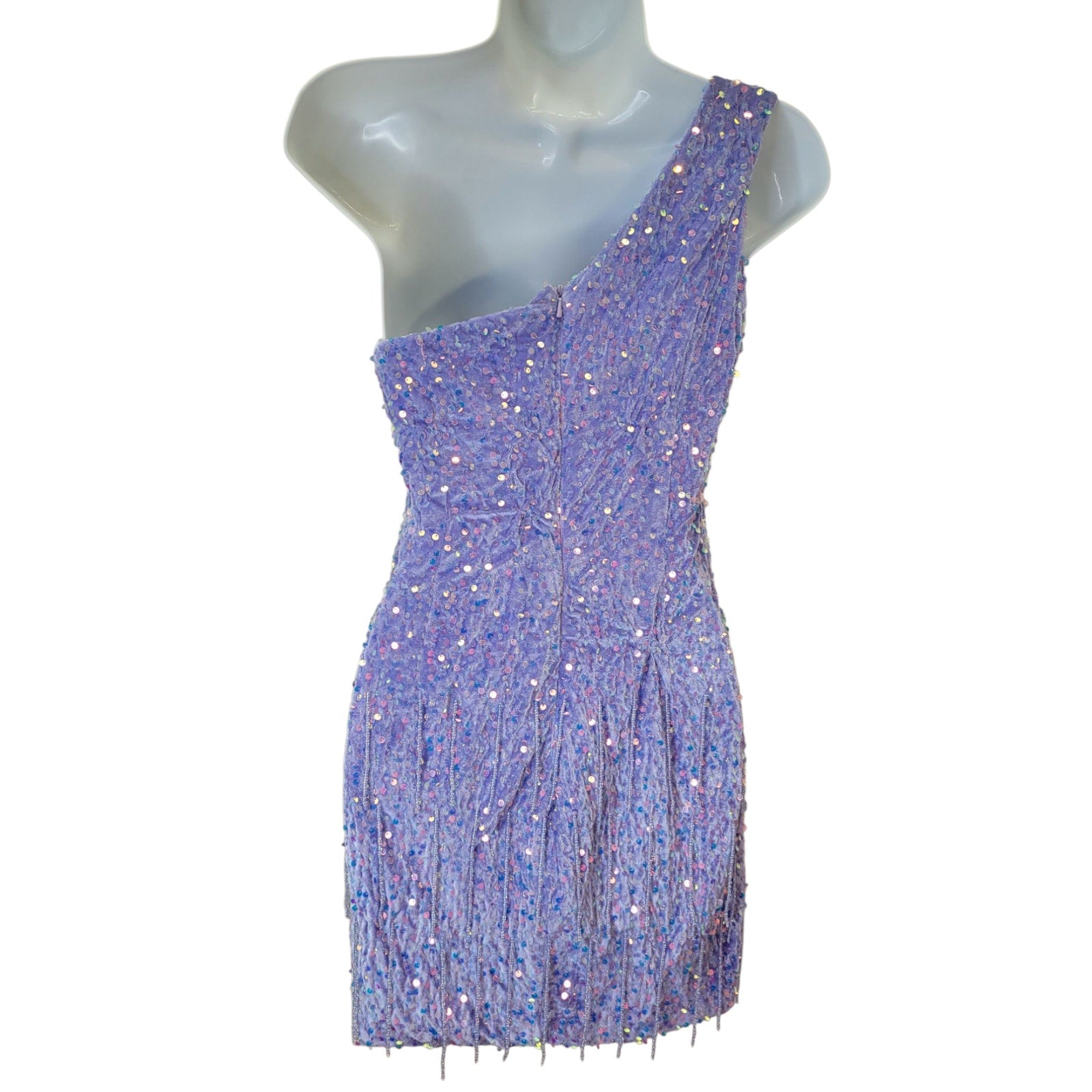 Women's Short Purple Sequin One Shoulder Dress with Beaded Fringe