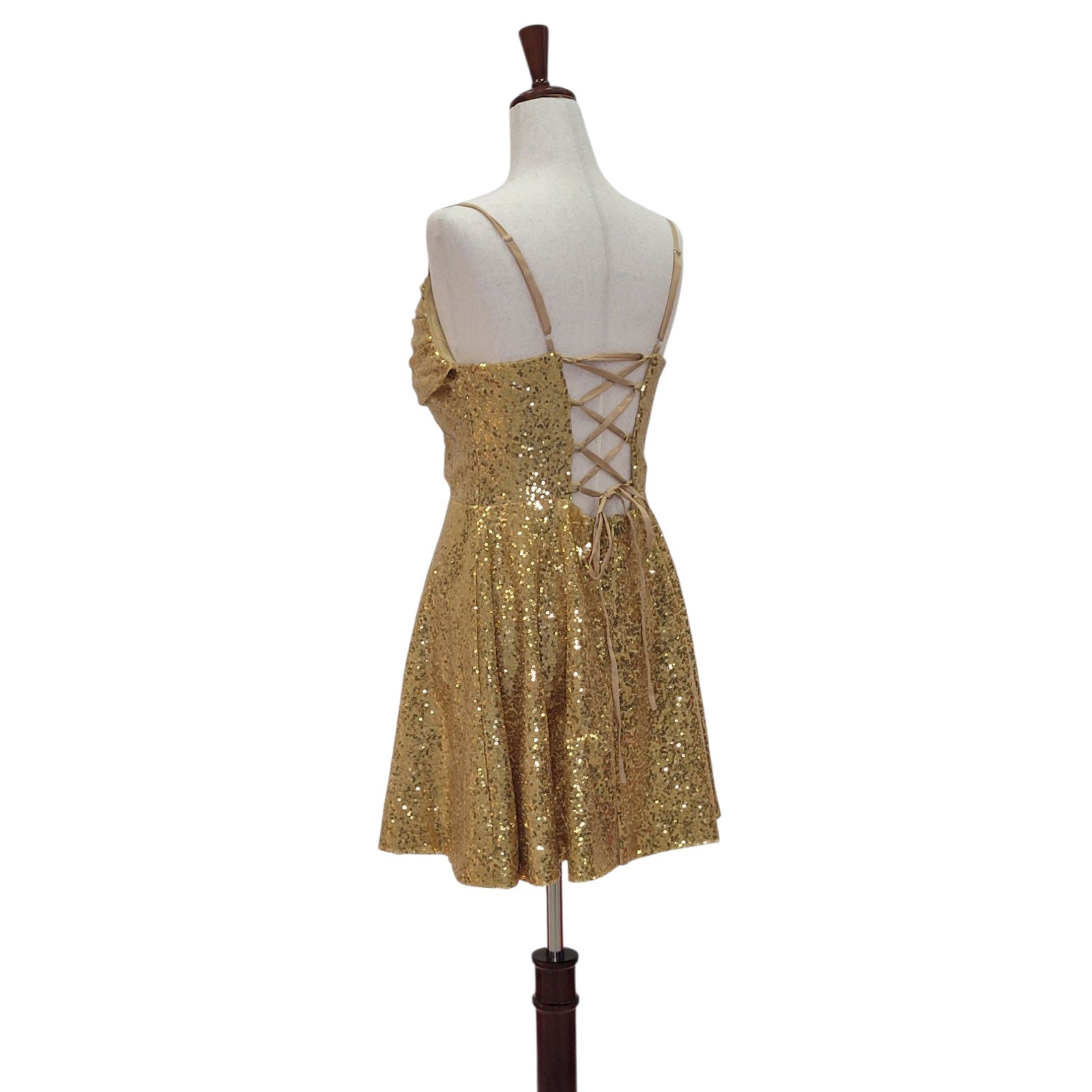 Shine bright in this playful women's short gold sequin dress featuring a flattering A-line silhouette and a chic corset back. Perfect for dancing the night away, its sparkling sequins catch every eye while the corset detail adds a touch of flirty elegance. Step into the spotlight with confidence and fun!