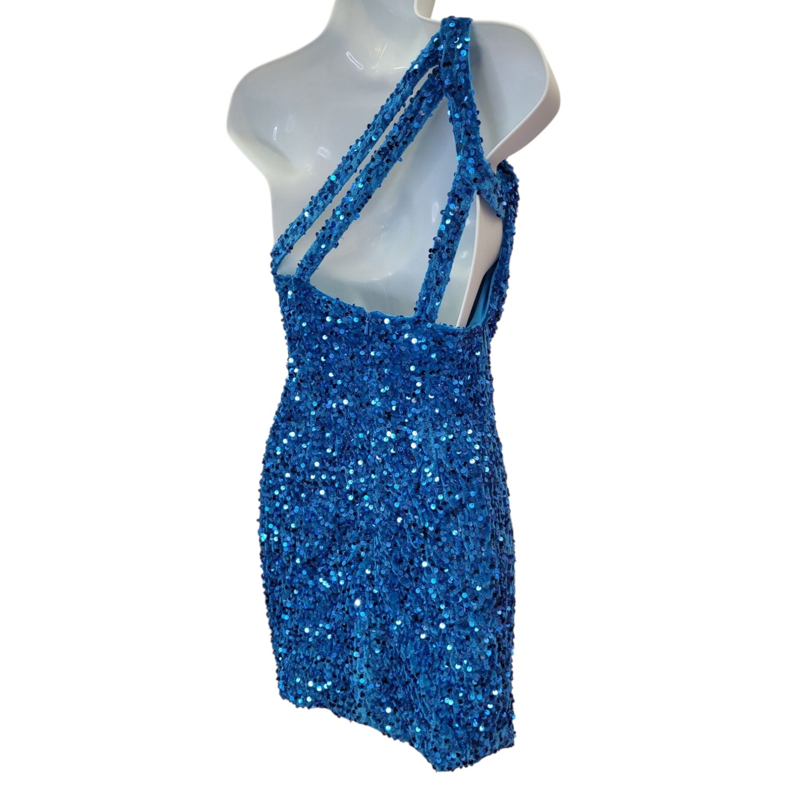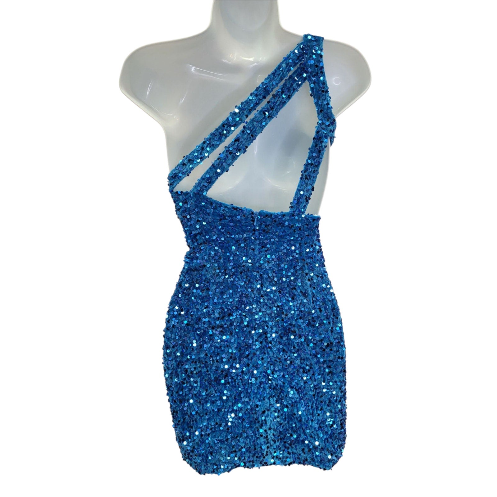 Turn heads in this playful women's short dress featuring shimmering sequins and a chic asymmetrical one-shoulder design. The strappy back adds a flirty touch, while the blue hue brings a classic sparkle. Perfect for parties or nights out, this dress combines sparkle and style effortlessly.